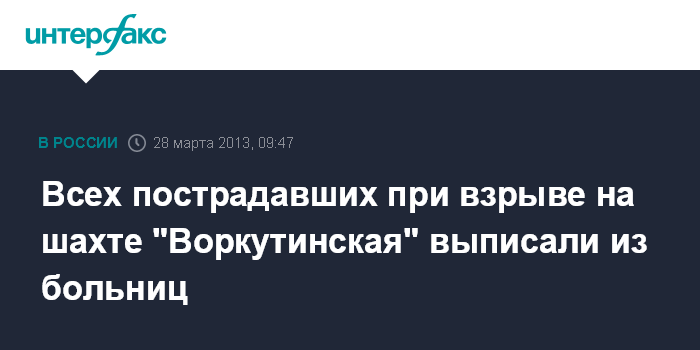 "Шахтер, получивший наиболее серьезные повреждения и пребывавший в институте хирургии имени А.Вишневского в Москве, прошел курс лечения и возвратился в Воркуту. Двое пострадавших - Владимир Торгунов и Виктор Лысенко, один из которых обратился за медицинской помощью более чем через сутки после аварии, находились в воркутинской больнице. Их тоже выписали, и они вернулись домой", - отметили в пресс-службе.