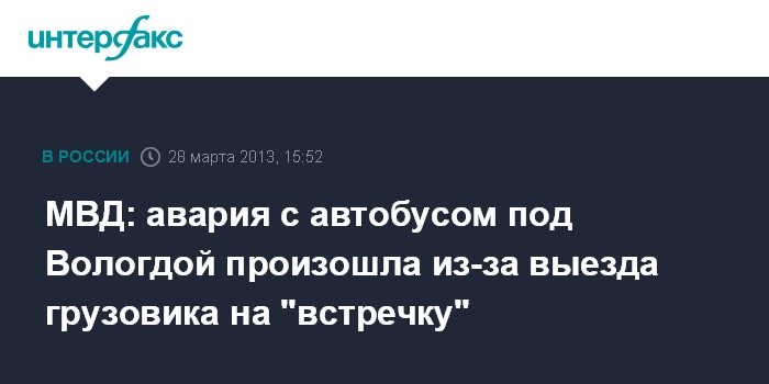 Москва. 28 марта. INTERFAX.RU - Причиной крупного ДТП в Вологодской области, где погибли шесть человек и еще 18 пострадали, стал выезд на встречную полосу грузового автомобиля, сообщили "Интерфаксу" в пресс-центре МВД России.