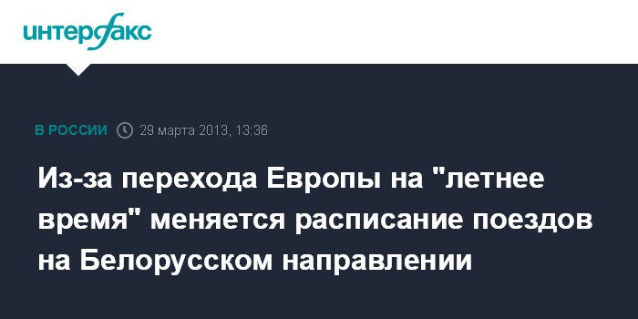 Москва. 29 марта. INTERFAX.RU - В связи с переводом в европейских странах часовой стрелки на летнее время будет частично изменено расписание движения пригородных электропоездов Белорусского направления МЖД.