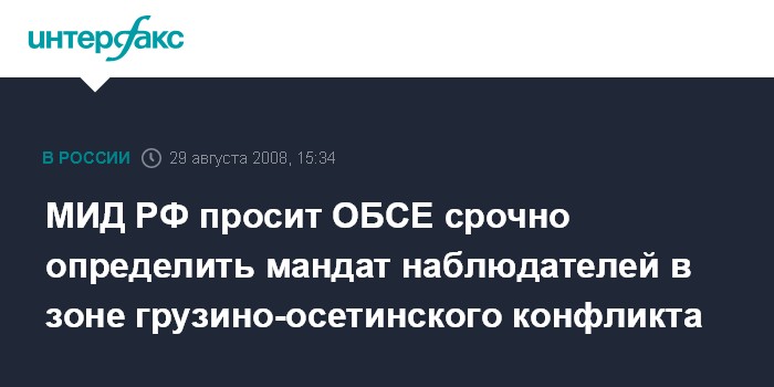 Москва. 29 августа. INTERFAX.RU - В Москве призывают ОБСЕ как можно скорее выработать мандат наблюдателей организации в зоне грузино-осетинского конфликта, а также считают необходимым максимально широкое присутствие стран ОБСЕ в миссии наблюдателей.