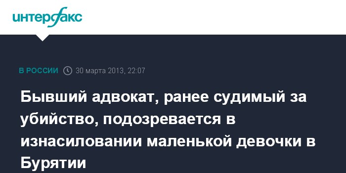 Чита. 30 марта. ИНТЕРФАКС-СИБИРЬ - В Северобайкальском районе Бурятии возбуждено уголовное дело в отношении бывшего адвоката, ранее судимого за убийство, подозреваемого в изнасиловании 8-летней девочки, сообщает пресс-служба республиканского СУ СКР.