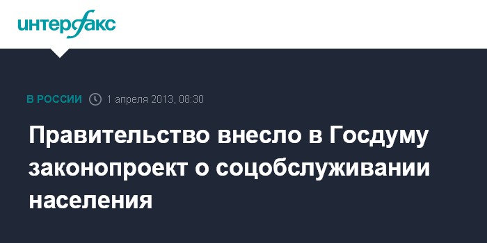 Москва. 1 апреля. INTERFAX.RU - Правительство России внесло в Госдуму проект федерального закона "Об основах социального обслуживания населения в Российской Федерации", говорится в сообщении нижней палаты парламента.