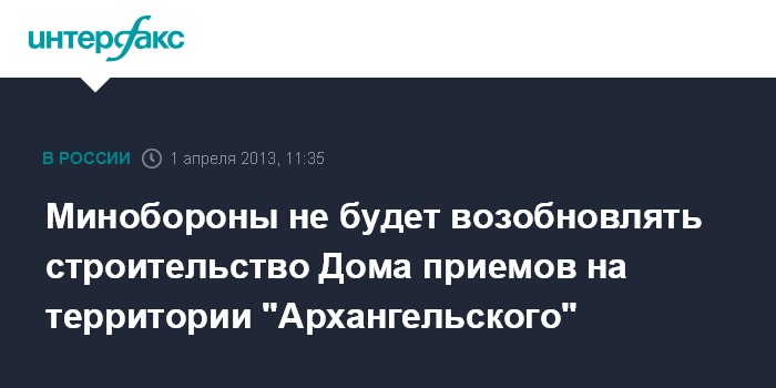 Москва. 1 апреля. INTERFAX.RU - Минобороны РФ не планирует возобновление ранее приостановленного строительства ведомственного Дома приемов на территории, прилегающей к дворцово-парковому ансамблю "Архангельское" в Подмосковье, заявил в субботу журналистам заместитель министра обороны РФ генерал-лейтенант Юрий Садовенко.