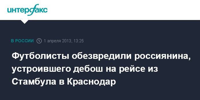 Москва. 1 апреля. INTERFAX.RU - Футболисты новороссийского клуба "Черноморец" обезвредили хулигана, летевшего рейсом Стамбул - Анталья - Краснодар 28 марта, сообщили порталу "Интерфакс-Туризм" в линейном отделе внутренних дел краснодарского аэропорта "Пашковский".