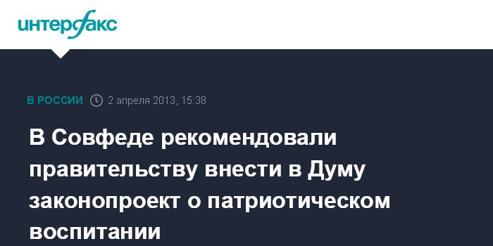 Москва. 2 апреля. INTERFAX.RU - Правительству России необходимо внести в Госдуму проект федерального закона "О патриотическом воспитании граждан России", считают в Совете Федерации.
