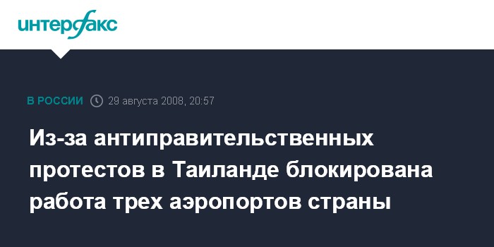 Бангкок. 29 августа. ИНТЕРФАКС - Три аэропорта Таиланда блокированы в пятницу участниками протестов, которые требуют отставки премьера Самака Сутнаравета. Сорвана работа аэропортов Пхукета, Краби и Хат Яя.