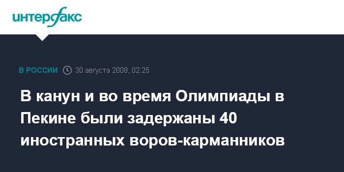 Пекин. 30 августа. ИНТЕРФАКС-КИТАЙ - Начиная с 1 июля и по 24 августа, накануне и во время проведения Олимпиады-2008 в Пекине, за грабежи и кражи были задержаны 40 иностранных граждан, сообщила в субботу столичная газета "Бэйцзин чэньбао" со ссылкой на данные пекинского управления общественной безопасности.