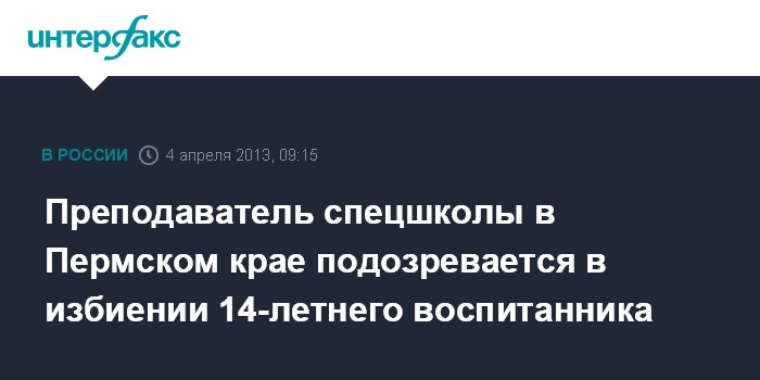 Пермь 4 апреля. INTERFAX.RU - Следственные органы СУ СКР по Пермскому краю возбудили уголовное дело в отношении преподавателя Теплогорской спецшколы закрытого типа, которая подозревается в избиении подростка. Как сообщает пресс-служба СУ СКР региона в четверг, инцидент произошел вечером 14 марта 2013 года. По версии следствия, подозреваемая, исполняя обязанности директора спецшколы, "нанесла побои 14-летнему воспитаннику".
