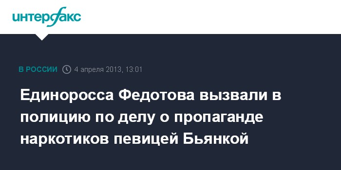 Как сообщил Федотов "Интерфаксу", в четверг ему позвонил следователь Василеостровского РУВД, которому поступило административное дело из Липецкой области по поводу того, что он в ноябре 2012 г. разместил видеозапись концерта с выступлением певицы Бьянки. "Ему необходимо опросить меня по материалам этого дела, я еду на беседу", - сказал Федотов.
