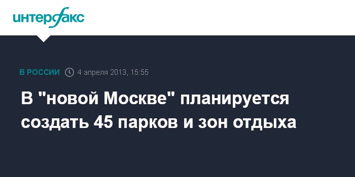 Москва. 4 апреля. INTERFAX.RU - На территории "новой Москвы" планируется обустройство 45 парков и зон отдыха, сообщил "Интерфаксу" руководитель департамента развития новых территорий столицы Владимир Жидкин.