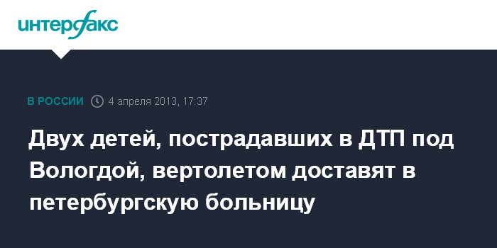 Москва. 4 апреля. INTERFAX.RU - Вертолет МЧС России вылетел из Санкт-Петербурга в Вологодскую область за пострадавшими неделю назад в ДТП воспитанниками детдома, сообщили в МЧС.