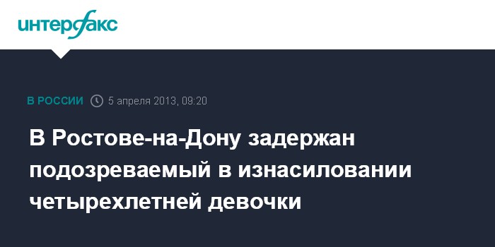 Ростов-на-Дону. 5 апреля. INTERFAX.RU - Сотрудники правоохранительных органов в одном из торговых центров Ростова-на-Дону задержали мужчину, подозреваемого в изнасиловании 4-летней девочки, сообщили в пятницу агентству "Интерфакс-Юг" в пресс-службе следственного управления СКР по Ростовской области.