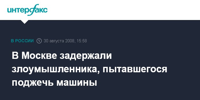 Москва. 30 августа. INTERFAX.RU – В Центральном округе Москвы задержан поджигатель машин, сообщил "Интерфаксу" начальник управления информации и общественных связей столичного ГУВД Москвы Виктор Бирюков.