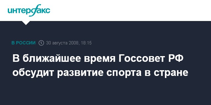 Москва. 30 августа. INTERFAX.RU - Вопросы, связанные с развитием спорта в России, будут обсуждаться в ближайшее время на заседании Госсовета РФ.