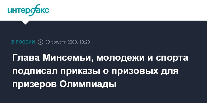 Москва. 30 августа. INTERFAX.RU - Министр Украины по делам семьи, молодежи и спорта рий Павленко подписал приказы министерства о выплате вознаграждений спортсменам национальной олимпийской сборной команды, которые заняли призовые места на играх XXIX Олимпиады в Пекине.