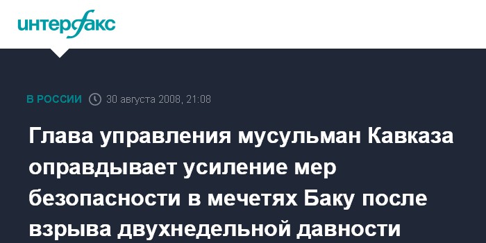 Баку. 30 августа. ИНТЕРФАКС-АЗЕРБАЙДЖАН - Меры безопасности, принятые в ряде мечетей Баку, призваны обеспечить защиту верующих, считает председатель управления мусульман Кавказа, шейхульислам гаджи Аллахшукюр Пашазаде.