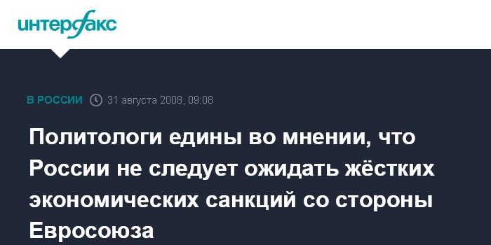 Москва. 31 августа. ИНТЕРФАКС - Финансово-экономические санкции ЕС в отношении России маловероятны, считают эксперты.