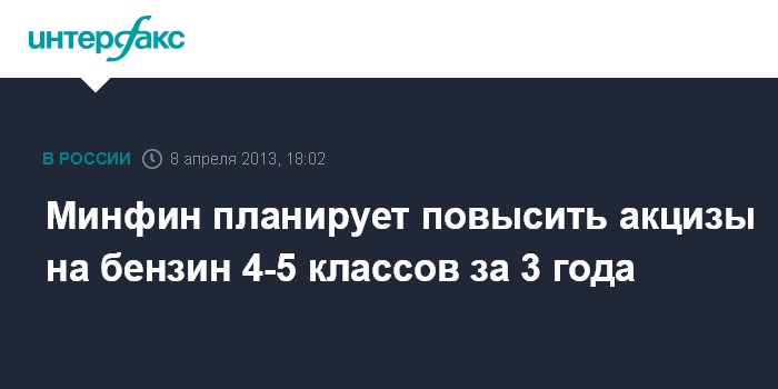 Москва. 8 апреля. INTERFAX.RU - Минфин будет предлагать повышать акцизы на бензин 4-го и 5-го классов до уровня акцизов на бензин 2-го и 3-го классов в течение трех лет, сообщил министр финансов Антон Силуанов журналистам в понедельник.