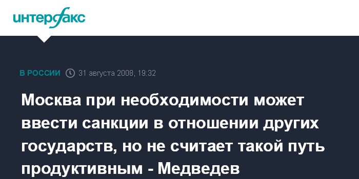 "Мы вообще не сторонники санкций, идем на это в самых крайних случаях", - сказал Д.Медведев в интервью трем российским телеканалам.