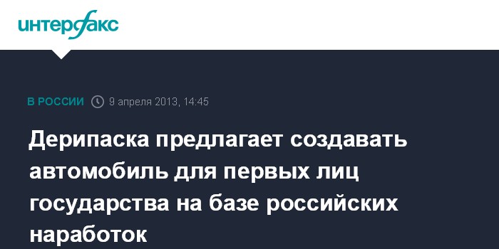 Нижний Новгород. 9 апреля. INTERFAX.RU - Автомобиль для первых лиц государства должен создаваться на базе существующих отечественных платформ, считает глава набсовета "БазЭла" Олег Дерипаска.