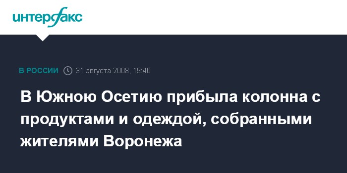 Цхинвали. 31 августа. ИНТЕРФАКС - Колонна с гуманитарной помощью, собранной осетинской общиной Воронежа, прибыла в Цхинвали, сообщает корреспондент "Интерфакса".