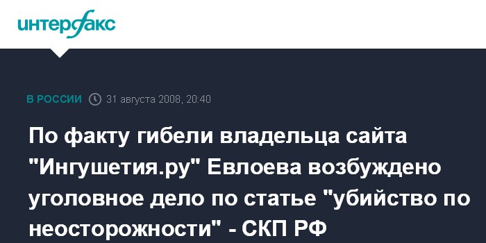 Москва. 31 августа. ИНТЕРФАКС - По факту ранения и смерти владельца интернет-портала "Ингушетия.ру" Магомеда Евлоева возбуждено уголовное дело по ст. 109 УК РФ (причинение смерти по неосторожности), - сообщил "Интерфаксу" в воскресенье официальный представитель Следственного комитета при прокуратуре (СКП) РФ Владимир Маркин.