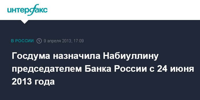 Москва. 9 апреля. INTERFAX.RU - Госдума на пленарном заседании назначила новым председателем Банка России Эльвиру Набиуллину. "Назначить Набиуллину Эльвиру Сахипзадовну на должность председателя Центрального банка РФ с 24 июня 2013 г.", - говорится в принятом нижней палатой парламента постановлении.
