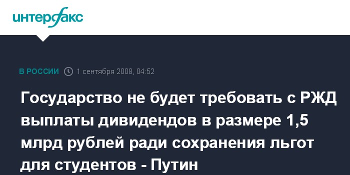 Государство не будет требовать с РЖД выплаты дивидендов в размере 1,5 млрд рублей ради сохранения льгот для студентов - Путин