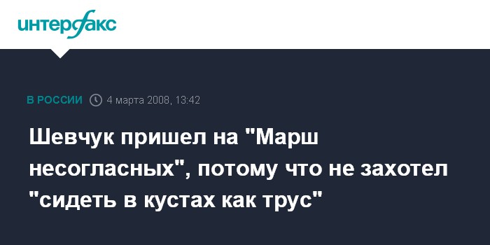 Санкт-Петербург. 4 марта. INTERFAX.RU - Лидер культовой рок-группа "ДДТ" Юрий Шевчук, принявший в понедельник участие в петербургском "Марше несогласных", считает "трусами тех, кто игнорирует общественный протест "несогласных"".