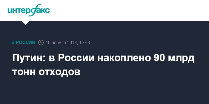 "Сегодня в России ежегодно скапливается порядка 3,5 млрд тонн отходов. Из них на переработку идет лишь примерно четверть. Остальное сжигается или вывозится на специальные полигоны. Но если бы только на специальные, а то и часто просто выбрасывается. Количество так называемых нелегальных свалок постоянно растет. Объем накопленных отходов в России составляет около 90 млрд тонн. Большая часть из них не имеет собственника", - заявил Путин на совещании по вопросу о стимулировании переработки отходов.