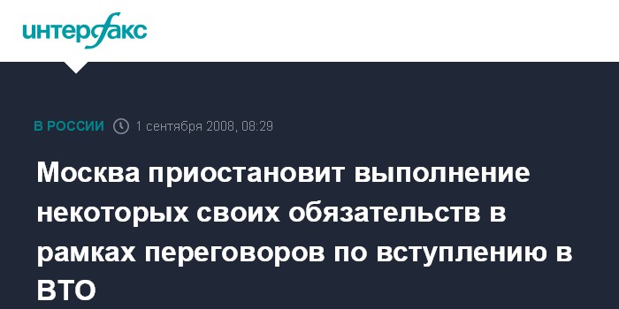 Москва. 1 сентября. INTERFAX.RU - Россия намерена приостановить выполнение некоторых обязательств в рамках переговоров по вступлению в ВТО в области сельского хозяйства и промышленности, заявил премьер-министр РФ Владимир Путин.