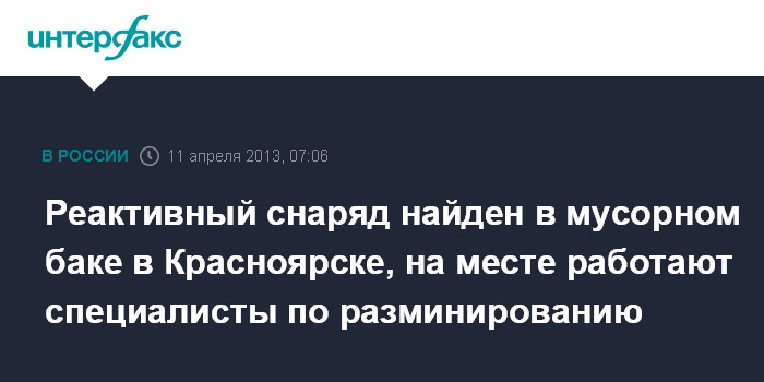 Красноярск. 11 апреля. ИНТЕРФАКС-СИБИРЬ - Реактивный снаряд обнаружен в мусорном баке во дворе жилого дома в Красноярске, сообщил агентству "Интерфакс-Сибирь" представитель ГУ МВД России по Красноярскому краю Владимир Юрченко.