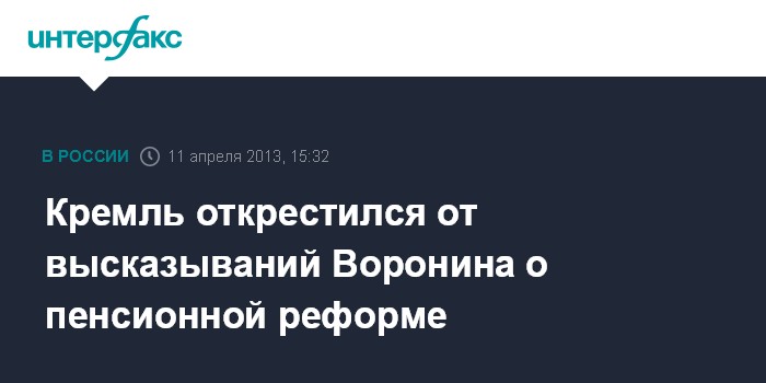 Москва. 11 апреля. INTERFAX.RU - В Кремле дезавуировали высказывание начальника управления президента РФ по социально-экономическому сотрудничеству с государствами СНГ Юрия Воронина по поводу пенсионной реформы. Данное высказывание "не отражает точку зрения администрации президента РФ и является его личной точкой зрения", заявили "Интерфаксу" в четверг в пресс-службе главы государства.