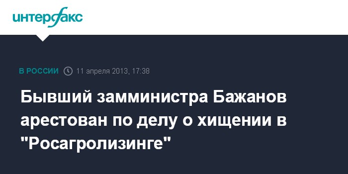 Москва. 11 апреля. INTERFAX.RU - Тверской суд Москвы санкционировал арест бывшего замминистра сельского хозяйства Алексея Бажанова по делу о хищении государственных средств в размере 1,1 миллиарда рублей у ОАО "Росагролизинг".
