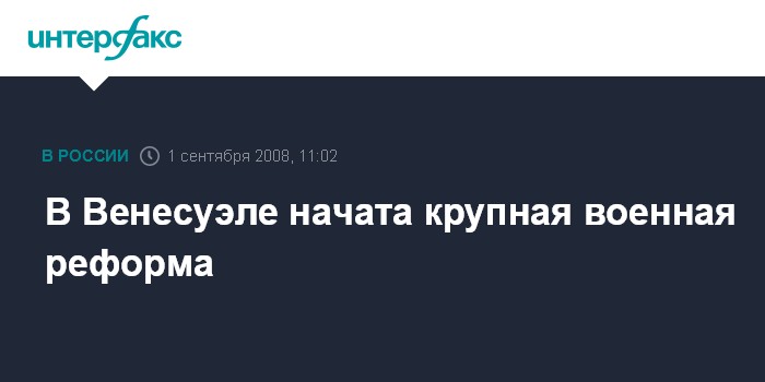 Москва. 1 сентября. INTERFAX.RU - Венесуэла приступила к масштабной и радикальной военной реформе, которую президент Уго Чавес обосновывает угрозой вторжения в страну со стороны США.