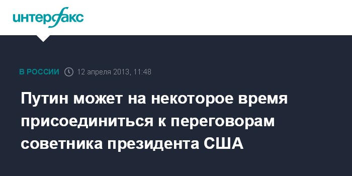 Благовещенск. 12 апреля. INTERFAX.RU - Владимир Путин может при появлении времени в рабочем графике присоединиться к переговорам советника президента США Томаса Донилона и секретаря Совбеза РФ Николая Патрушева.