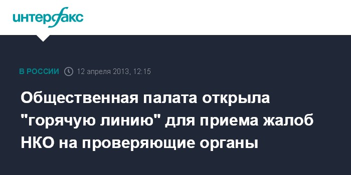 Москва. 12 апреля. INTERFAX.RU - Общественная палата России открыла "горячую линию" для жалоб некоммерческих организаций на действия проверяющих органов.