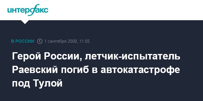 "30 августа в 16:20 на 149-м километре трассы Москва-Волгоград в 40 километрах от Тулы "Волга", за рулем которой был полковник Раевский, врезалась в "КАМАЗ". Погиб офицер и его жена - Людмила Раевская", - сказал собеседник агентства.