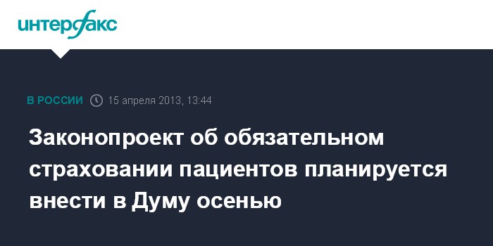 Москва. 15 апреля. INTERFAX.RU - Минздрав России надеется, что законопроект "Об обязательном страховании пациентов при оказании медицинской помощи" будет направлен в Госдуму осенью.