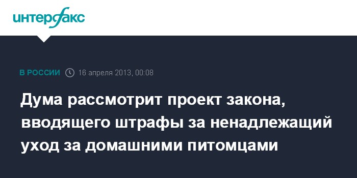 Москва. 16 апреля. INTERFAX.RU - Госдума рассмотрит во вторник в первом чтении законопроект, предлагающий ввести штрафы за нарушение правил содержания кошек и собак.