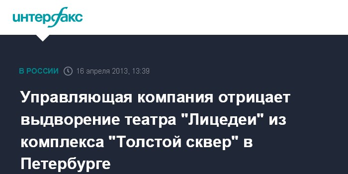 Директор управляющей компании "Толстой сквер" подчеркнул, что имеет место конфликт между арендатором и арендодателем. По информации собственников здания, в настоящее время ООО "Творческий центр "Лицедеи" (в котором, как пояснил Вдонин, 100% долей принадлежит Соловьеву) не имеет действующего договора аренды театральных помещений с ООО "И-Инвест" (собственник комплекса). По словам директора управляющей компании "Толстой сквер", для разрешения ситуации собственники комплекса обратились в правоохранительные органы и готовят иски.