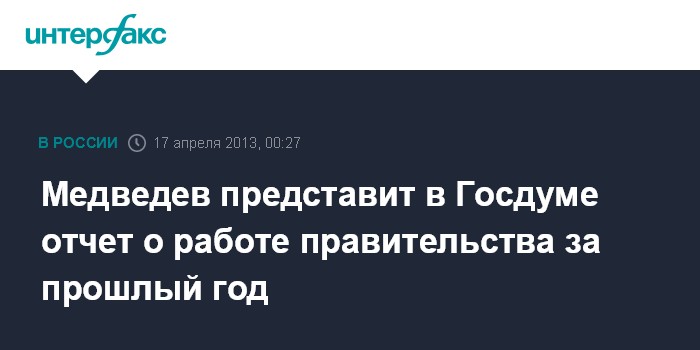 Москва. 17 апреля. ИНТЕРФАКС - Правительство РФ отчитается в среду перед Госдумой о своей деятельности в 2012 году.