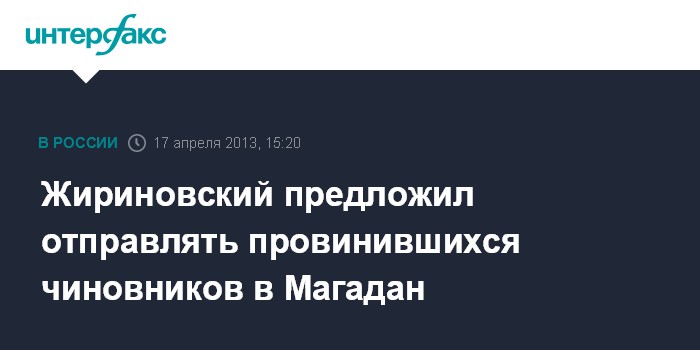 Москва. 17 апреля. INTERFAX.RU - Лидер ЛДПР и ее фракции в Госдуме Владимир Жириновский предложил председателю правительства Дмитрию Медведеву отправлять проштрафившихся чиновников если не в отставку, то работать на Дальний Восток.