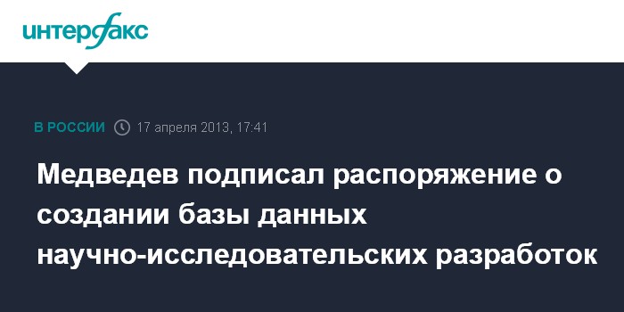 Москва. 17 апреля. INTERFAX.RU - В России будет создана единая государственная информационная система учета научно-исследовательских, опытно-конструкторских и технологических работ гражданского назначения. Соответствующее постановление правительства РФ подписал премьер-министр Дмитрий Медведев.