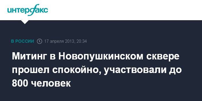 "Сегодня общественно-политическое мероприятие, которое проходило в Новопушкинском сквере, посетило до 800 участников", - сообщили "Интерфаксу" в пресс-службе ГУ МВД по Москве.