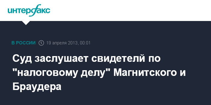 Москва. 19 апреля. INTERFAX.RU - Тверской суд Москвы в пятницу продолжит заслушивать свидетелей обвинения в рамках заочного процесса по делу об уклонении от уплаты налогов против скончавшегося в СИЗО аудитора фонда Hermitage Capital Сергея Магнитского и главы организации Уильяма Браудера.