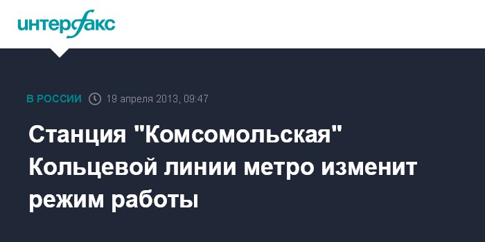 Москва. 19 апреля. INTERFAX.RU - Режим работы станции "Комсомольская" Кольцевой линии изменится с 24 апреля, сообщили "Интерфаксу" в пресс-службе Московского метрополитена в пятницу.