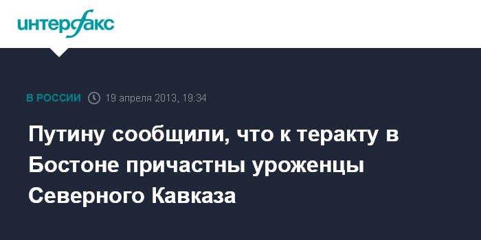 Сочи. 19 апреля. INTERFAX.RU - Президенту РФ Владимиру Путину известно о сообщениях, согласно которым след бостонского теракта, возможно, ведет к уроженцам Северного Кавказа.