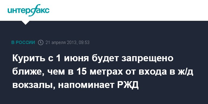 Москва. 21 апреля. ИНТЕРФАКС - Курение с 1 июня будет запрещено на расстоянии менее чем в 15 метров от входа в железнодорожный вокзал.