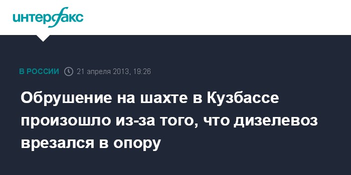 Кемерово. 6 апреля. ИНТЕРФАКС-СИБИРЬ - Обрушение в выработке шахты "Заречная" (г.Полысаево, Кемеровской области) произошло после того, как дизелевоз, перевозивший шахтеров в лаву, задел крепь, сообщили агентству Интерфакс-Сибирь в обладминистрации.